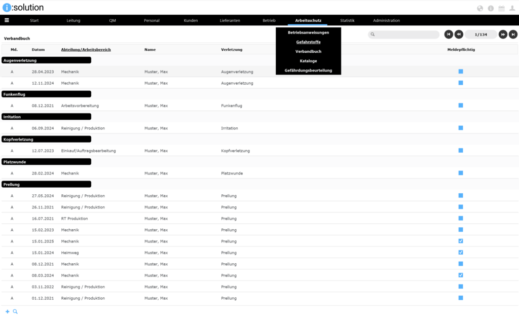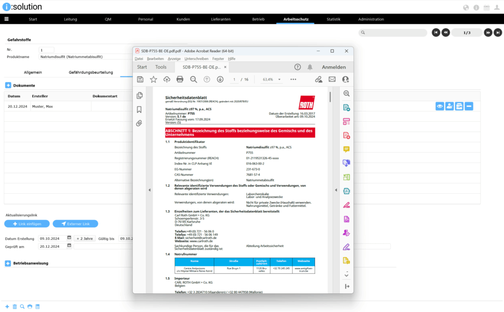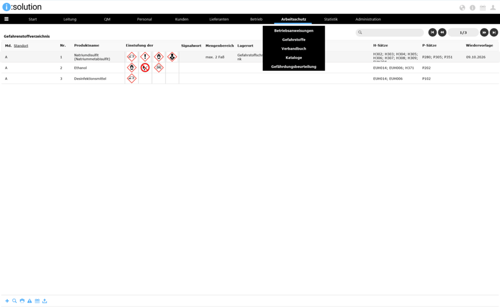 Das Modul „Arbeitsschutz“ unserer QM-Software i:solution CAQ unterstützt das Handling mit gefährlichen Stoffen in Ihrem Unternehmen, um sämtliche Gesundheits- und Umweltschutzmaßnahmen sicherzustellen. Es bietet eine zentrale Verwaltung aller im Unternehmen eingesetzen Gefahrenstoffe. Ein schneller Zugang zu wichtigen Informationen zu Gefahrenstoffen ist somit gesichert.