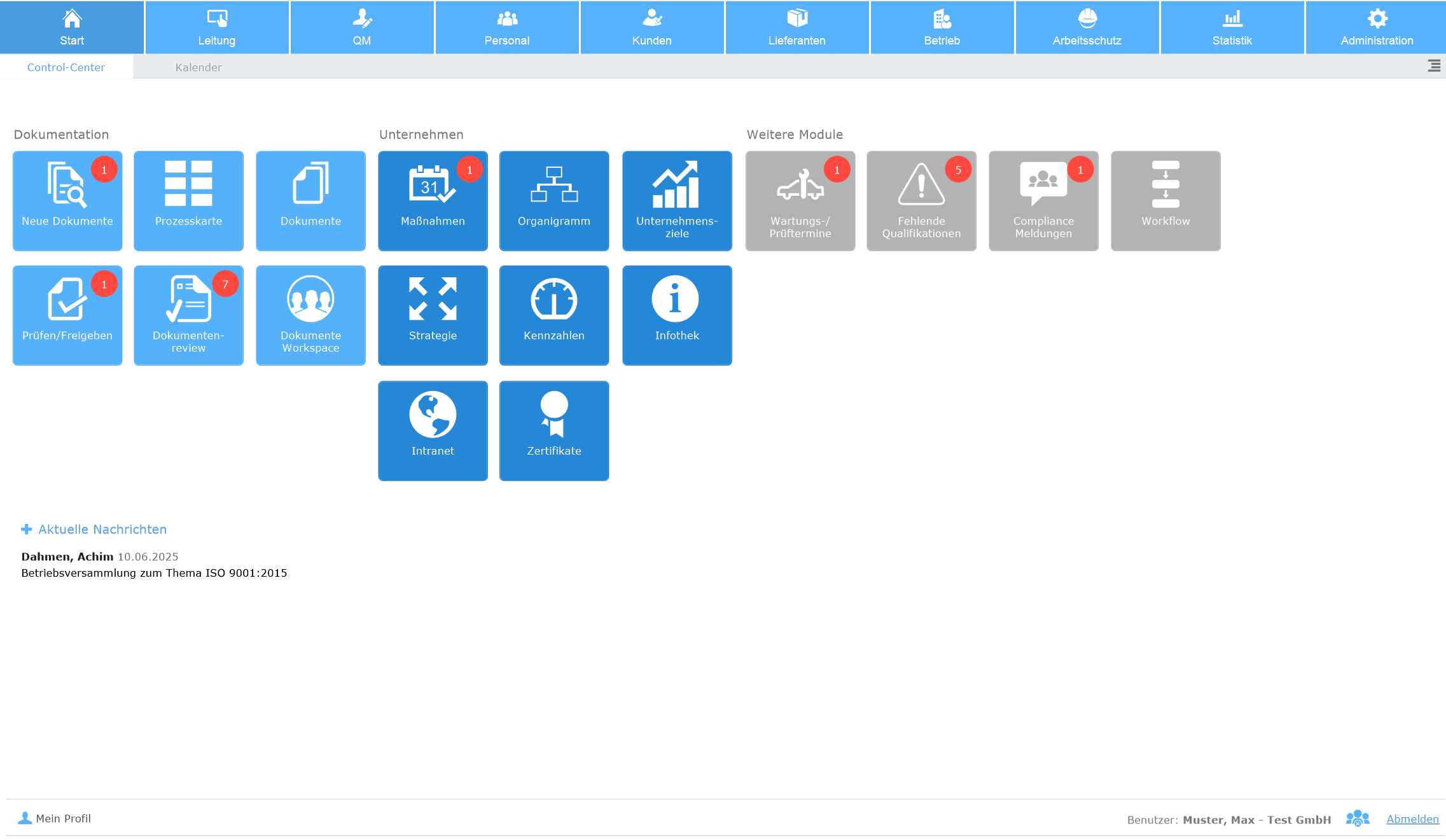 In der nachfolgenden Abbilung sehen wir das Control-Center, welches automatisch immer die Startseite ist.