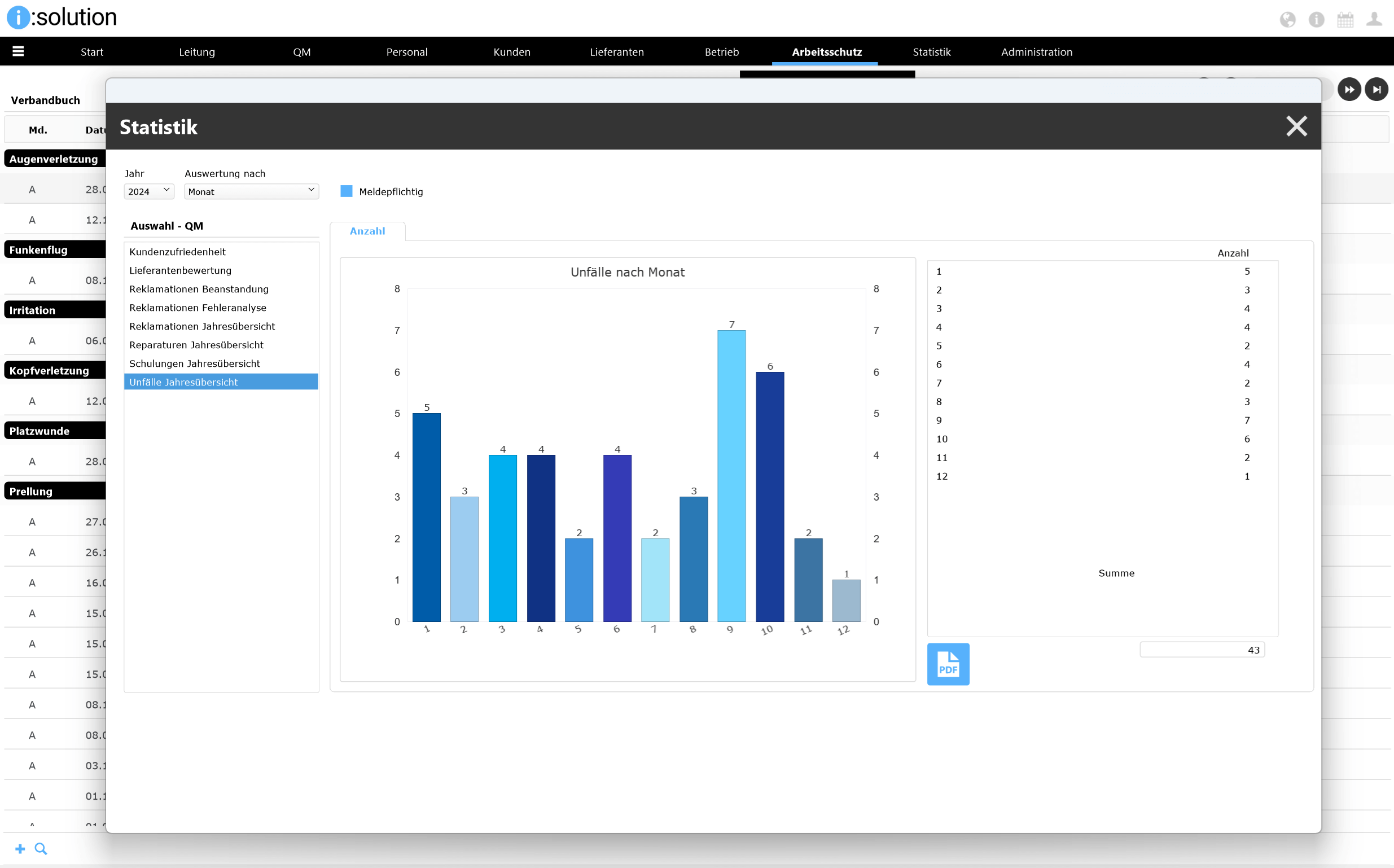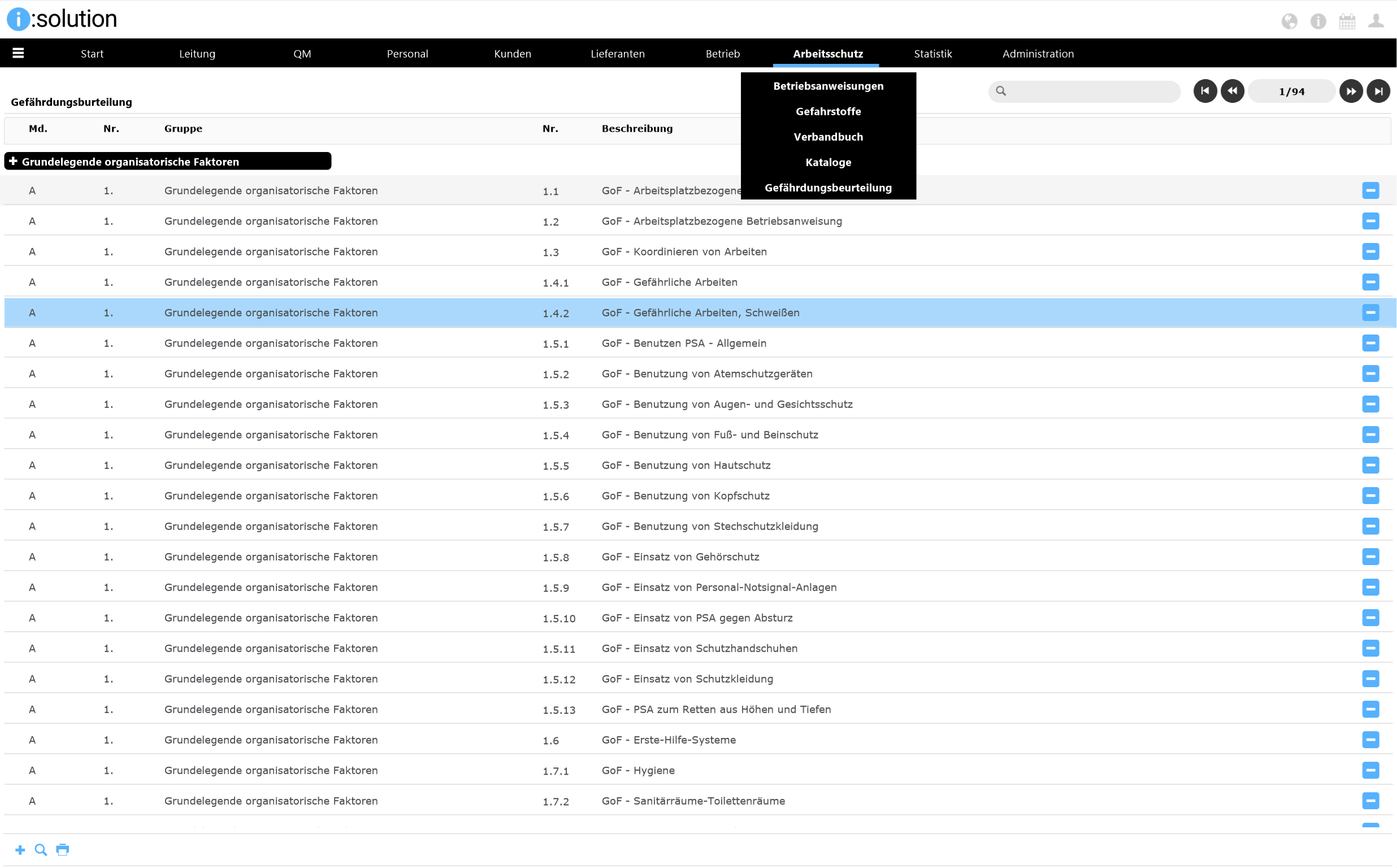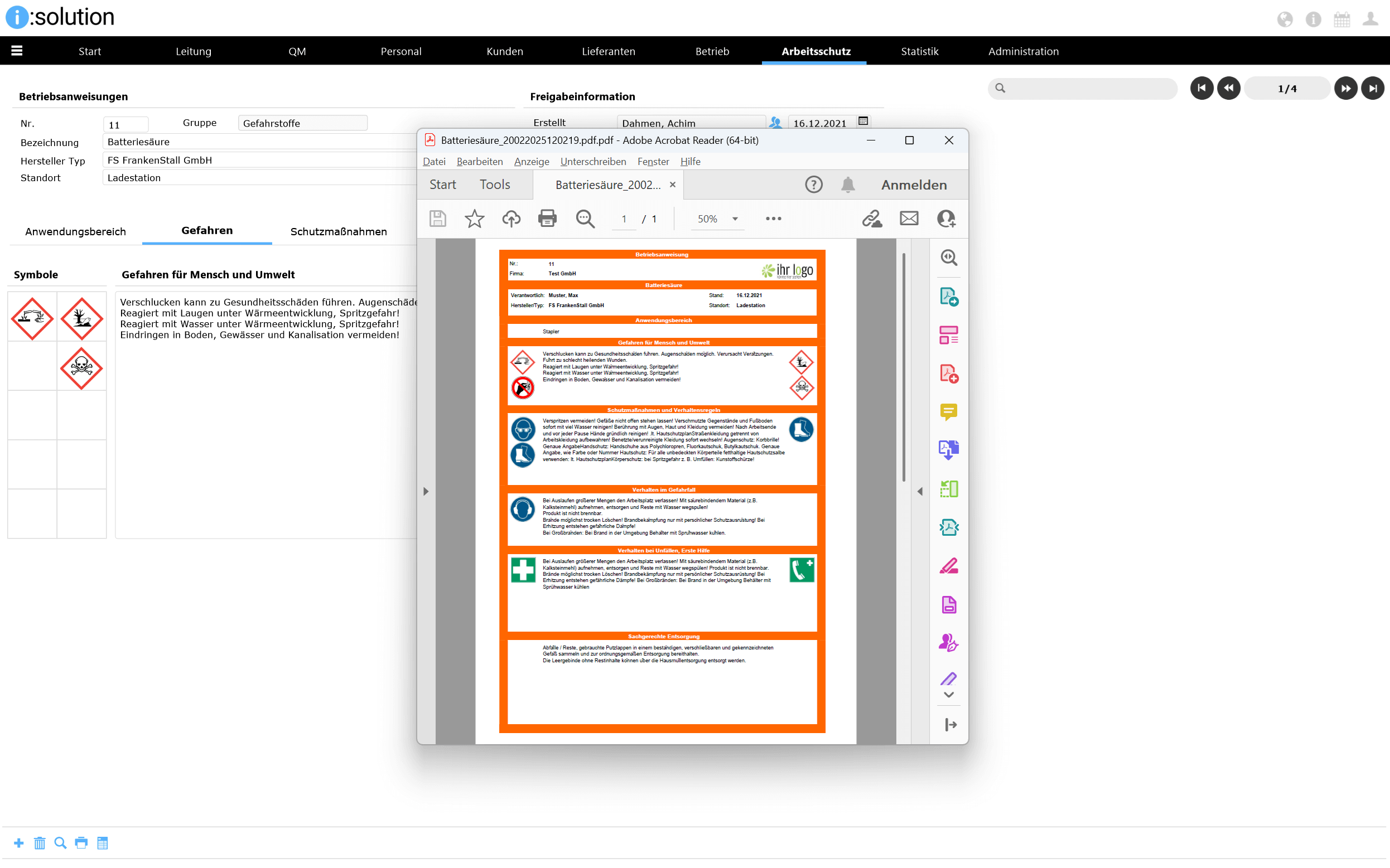 Das Modul „Arbeitsschutz“ unserer QM-Software i:solution CAQ unterstützt das Handling mit gefährlichen Stoffen in Ihrem Unternehmen, um sämtliche Gesundheits- und Umweltschutzmaßnahmen sicherzustellen. Es bietet eine zentrale Verwaltung aller im Unternehmen eingesetzen Gefahrenstoffe. Ein schneller Zugang zu wichtigen Informationen zu Gefahrenstoffen ist somit gesichert.